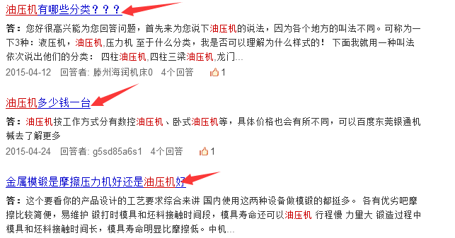 像百度知道、搜索問問、天涯問答,或者相關的行業論壇,只要搜索一下關鍵詞,就可以找到很多用戶提問的問題,而這些問題里面出現的關鍵詞很大程度都是用戶需求的。比如下圖中,我們在百度知道搜索“油壓機”也可以挖掘到大量的關鍵詞。