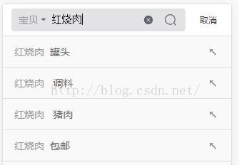 這里看到的組件化只是UI表現層的組件化,完整的組件化還包括交互事件、展現樣式、數據交互,也就是說組件擁有自己的屬性、方法以及數據交互能力。比如常見的搜索提示列表,用戶輸入信息傳到服務器上,服務器根據用戶輸入詞查找后將數據返回前端,再由前端展示,效果如下: