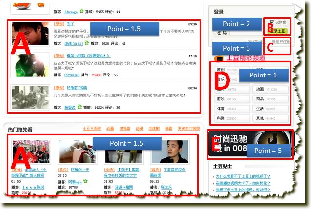 考慮這個頁面的不同交互,哪些是你認(rèn)為重要的,哪些是次重要的,哪些是不重要的。在這個例子中,我們假設(shè)存在一個在線營銷活動,我們最希望用戶點 擊E區(qū),訪問“時尚迅馳”的活動頁面;其次,我們希望用戶盡量注冊我們的網(wǎng)站,也就是C區(qū),然后我們希望用戶登陸,即B區(qū);再次,我們希望用戶至少能夠訪 問頁面中的視頻,即A區(qū)。最后,最低限度,我們覺得用戶點擊訪問“精彩頻道”(D區(qū))也有點兒價值,只不過價值沒有前述行為那么大。這樣,我們就有了一個 圖景:用戶訪問的價值從大到小依次是:E>C>B>A>D。