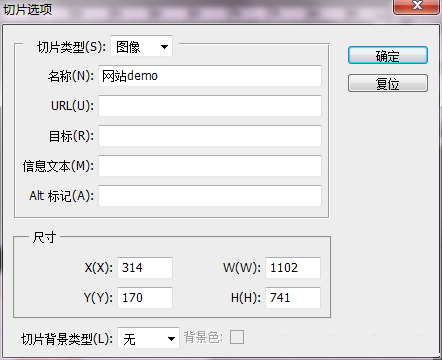 切片選項 -- 劃取完分區以后,要對切片進行一些設定是很重要的,切片工具下Alt+點擊切片,會彈出如下窗口