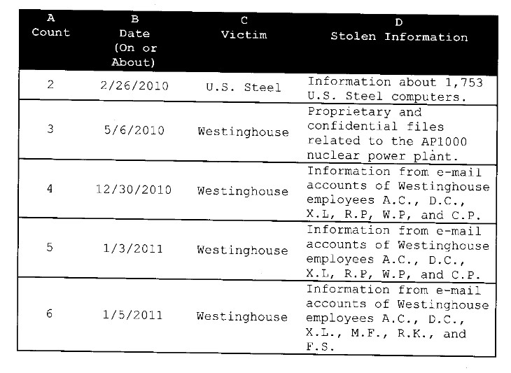 美國司法部認為有必要起訴的理由是認為這個刺探行動超越了他們“給自己劃定”的軍事、政治領域,而將刺探的信息用于經濟目的。在起訴書中大量列舉了受害者的失竊信息,我猜想他們都應該向FBI報案了。